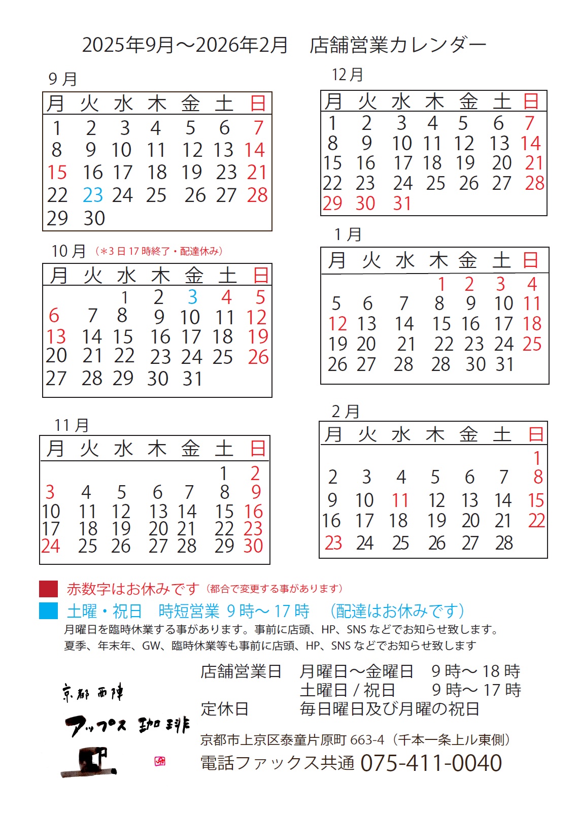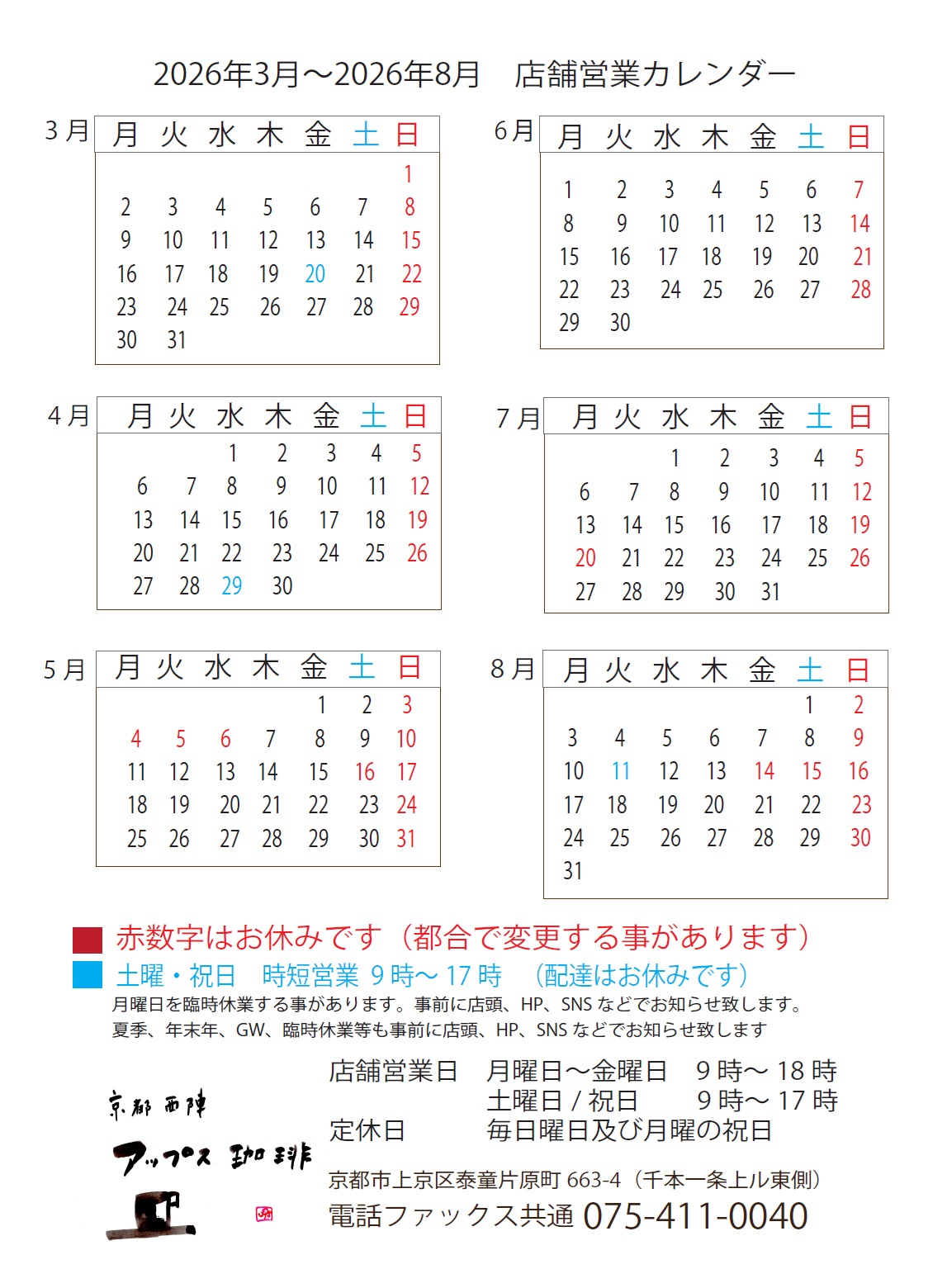 西陣千本商店街で営業。千本今出川の交差点から南へ信号1つと少し。ポストが目印です。小売りは100gより、豆のまま、又はお好みの粗さでお挽きします。こだわりのコーヒー器具の販売もあります。ご購入重量によって割引サービスも行っております。業務卸や発送も承りますので、お気軽にお尋ねください。